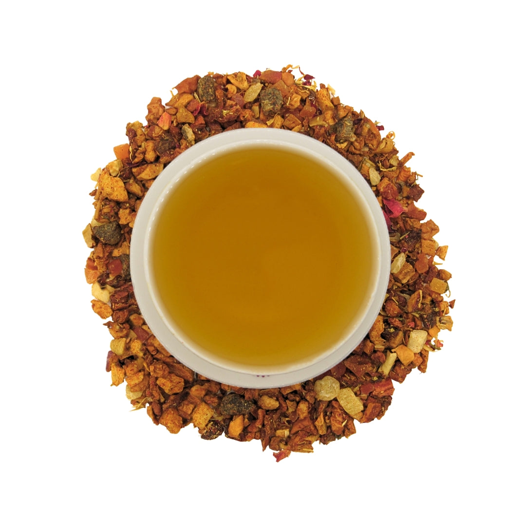 In each sip, the infusion unfolds with the sweet and slightly tart notes of apple, complemented by the vibrant hue and subtle tartness from hibiscus petals. The tropical richness of mango and papaya adds a luscious depth to the tea, while sunflower petals contribute to its visual elegance.
