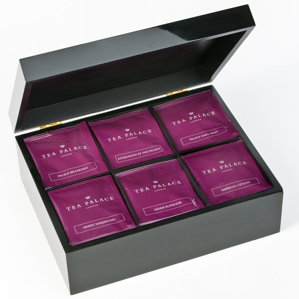 The presentation box has a high gloss, lacquer finish and a fabric lined base to prevent slipping on surfaces, with a 6 compartment divider inside to keep your sachets neatly inside.