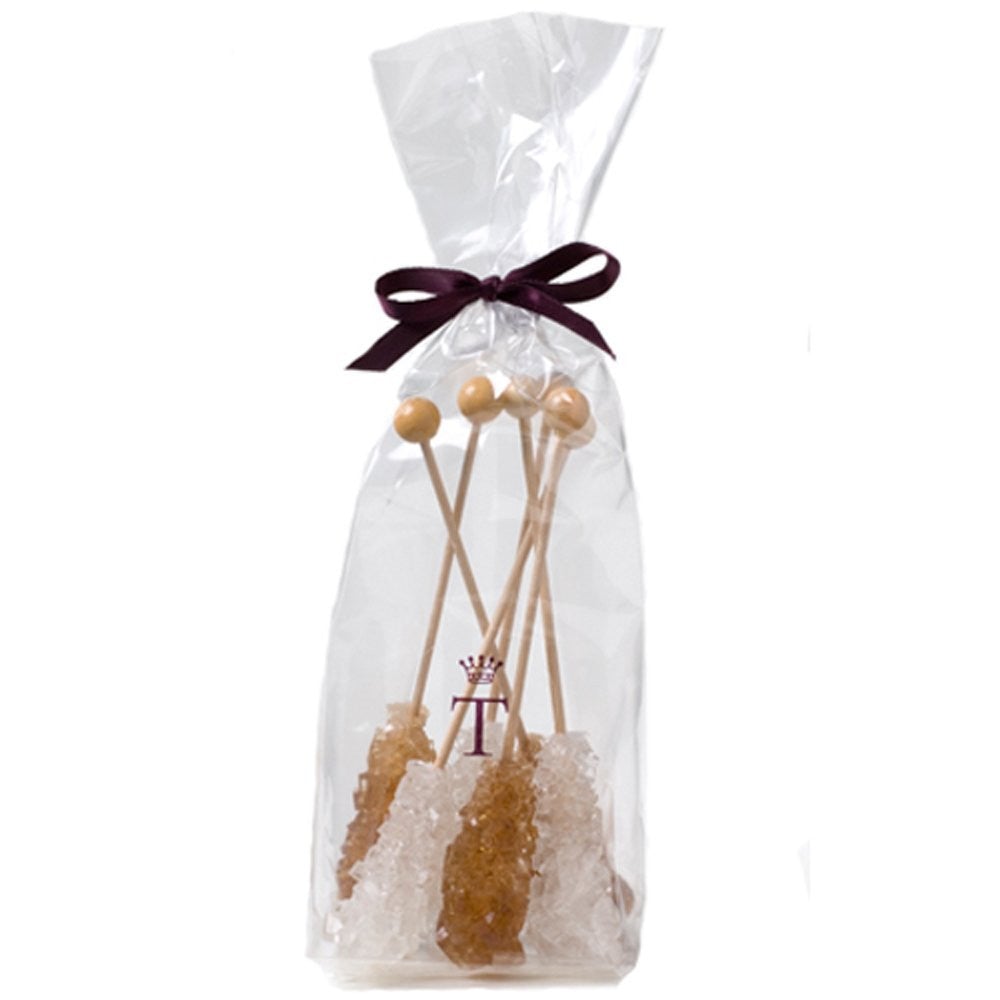 Six Crystal Sugar Sticks presented in a cellophane bag tied with satin ribbon - contains three white and three brown.