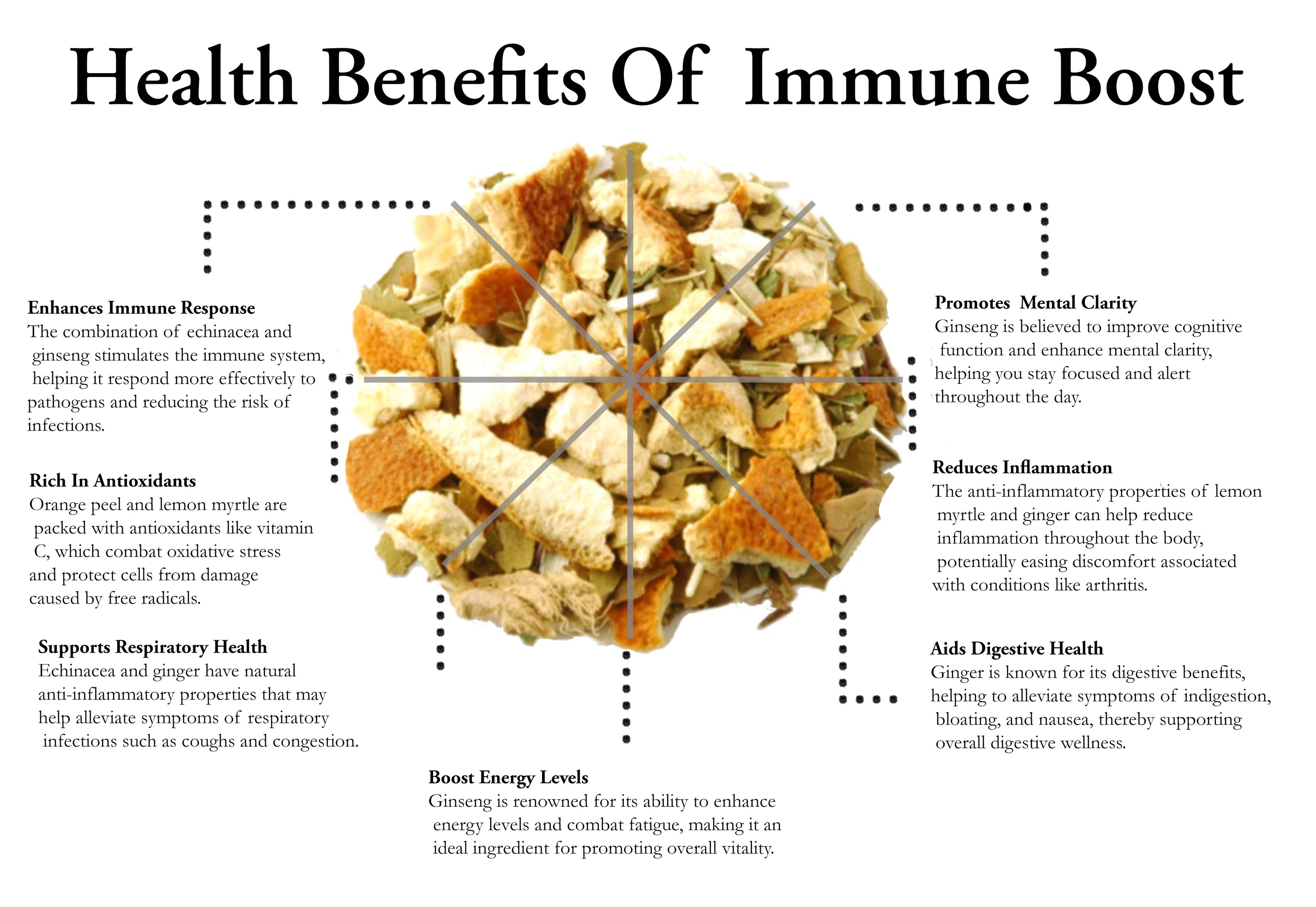 Sipping on a cup of Immune Boost tea offers more than just a delightful taste experience. Its blend of immune-enhancing herbs and botanicals may help strengthen the body's natural defences, protect against seasonal illnesses, and promote overall vitality.