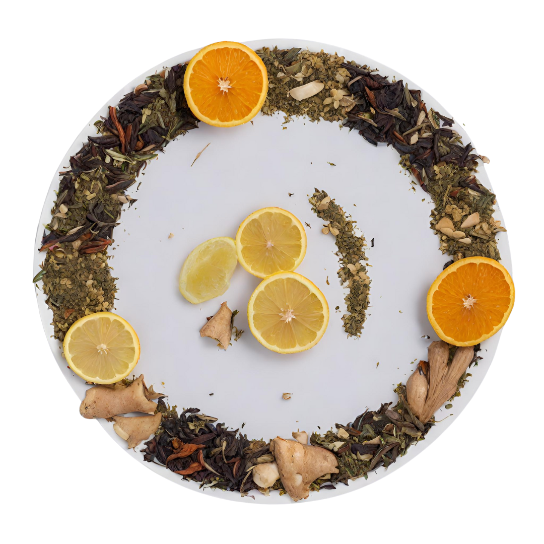 The infusion begins with zesty citrus, offering an immediate burst of bright, refreshing flavours. The tartness of orange peel and lemon myrtle is beautifully complemented by the gentle heat of ginger, creating a lively and invigorating base. This vibrant combination provides a natural energy lift, while the additional presence of echinacea adds a subtle earthy undertone, known for its immune-boosting properties. The fusion of ginseng completes the blend, adding a mild, bittersweet finish that enhances the overall sense of vitality.