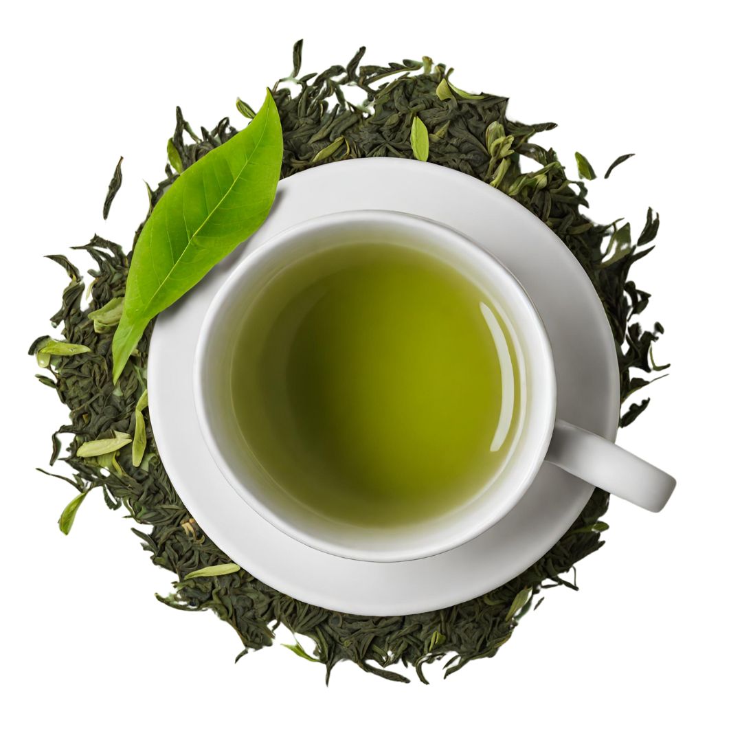 The blend features the fresh and slightly vegetal notes of green tea, contributing to a clean and uplifting base.