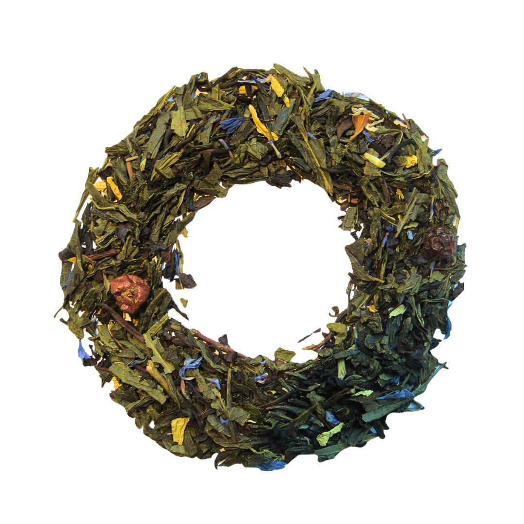 Green Tea, Oolong Tea, Flavouring, Freeze-dried Redcurrants, Cornflower Blossoms, Sunflower Blossoms.