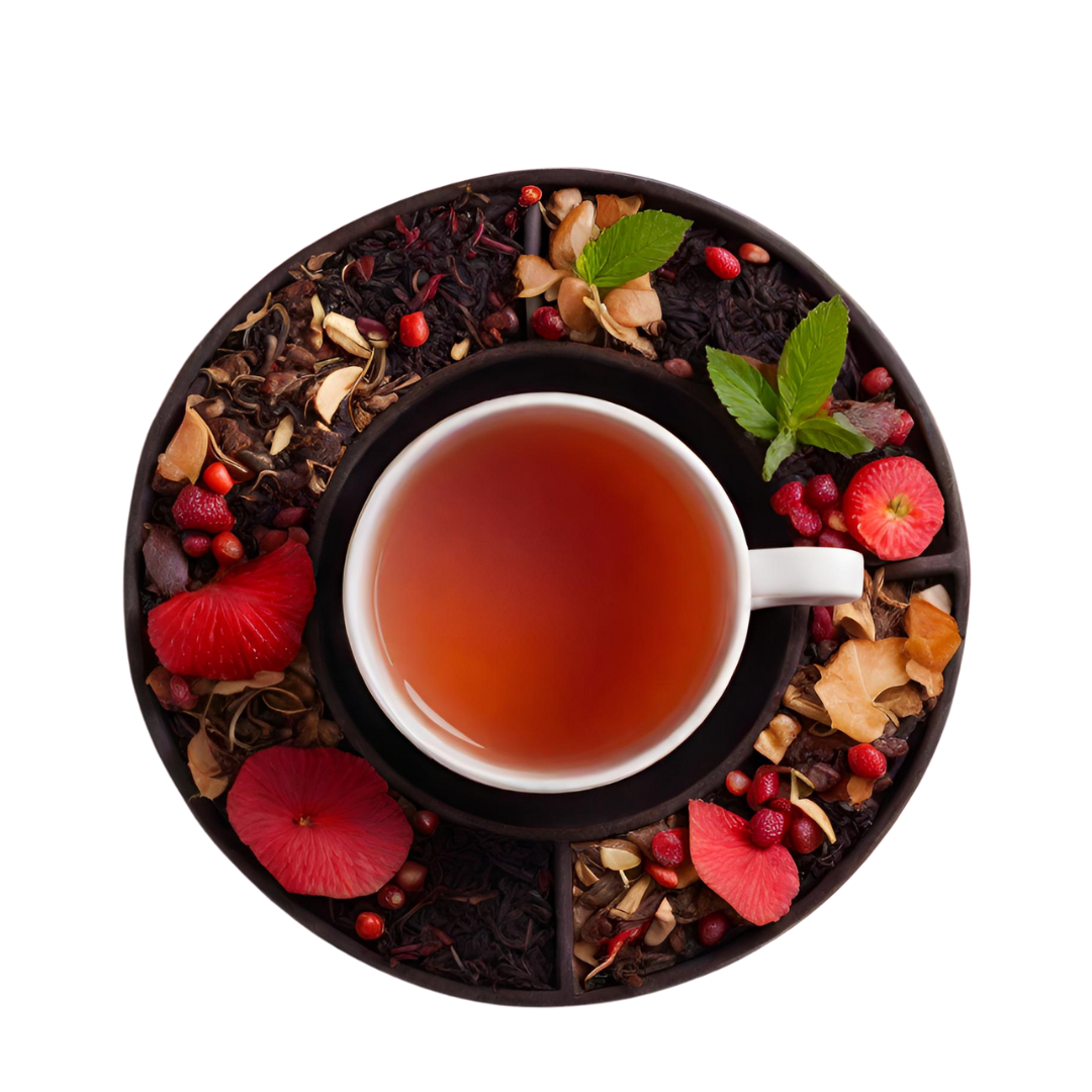 The base of black tea provides a rich and robust foundation for the blend, offering depth and complexity to each sip. Apple pieces add a natural sweetness, while hibiscus blossoms impart a bright and tangy note that enhances the overall flavour profile. Elderberries, rosehips, raspberry pieces, and strawberry pieces contribute their distinct fruity flavours, creating a medley of tastes that dance across the palate.