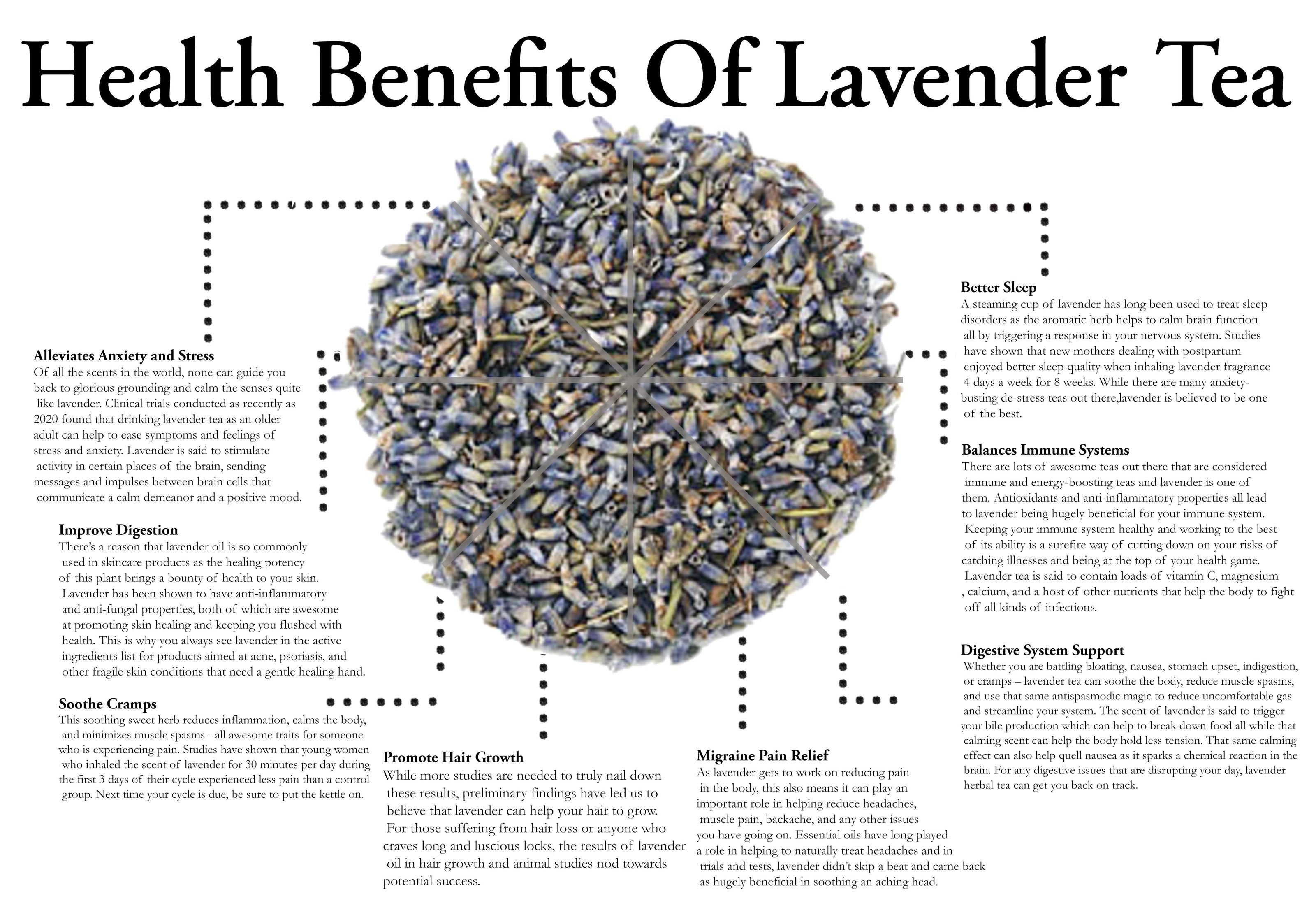 Lavender is renowned for its potential calming and stress-relieving properties. Drinking lavender tea is often associated with relaxation and may contribute to a sense of tranquility.